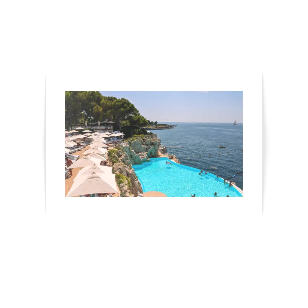 The photograph balances the turquoise glow of the pool with the vast expanse of the sea beyond, where sailboats and kayakers drift under the Riviera sun. The scene is both cinematic and serene, offering a glimpse into a lifestyle defined by beauty, exclusivity, and relaxation. Known as a playground of the elite since the 19th century, Eden Roc remains synonymous with Riviera sophistication—and this artwork transports you directly into that atmosphere.