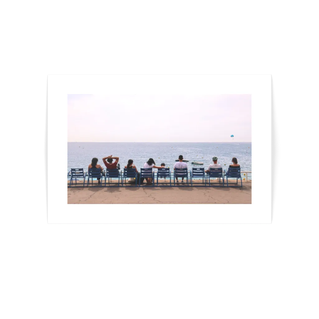 Prom. des Anglais is a quintessential Nice Print, capturing the spirit of one of the French Riviera’s most iconic seaside promenades. The photograph frames a row of the famous blue chairs that line the seafront, filled with people gazing out across the expanse of the Mediterranean. Some lean back with arms behind their heads, others sit quietly in pairs, while a few simply lose themselves in the horizon. It is a scene that feels both ordinary and timeless—everyday life rendered poetic by the simplicity of sitting and looking out to sea.