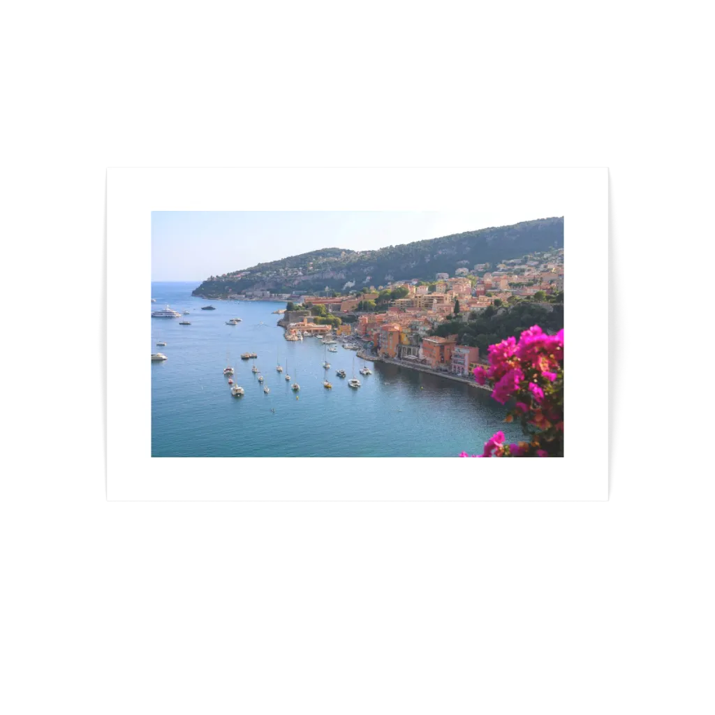 Capture the essence of the French Riviera with Bougainvillefranche, a breathtaking Villefranche Print that blends natural beauty with Mediterranean charm. This fine art photograph looks out over the famous bay of Villefranche-sur-Mer, one of the most picturesque harbors in the South of France. The scene is framed by vibrant pink bougainvillea in the foreground, leading the eye across a turquoise sea scattered with sailboats and luxury yachts. Along the shoreline, pastel-colored buildings climb the hillside, their warm hues glowing under the Mediterranean sun.