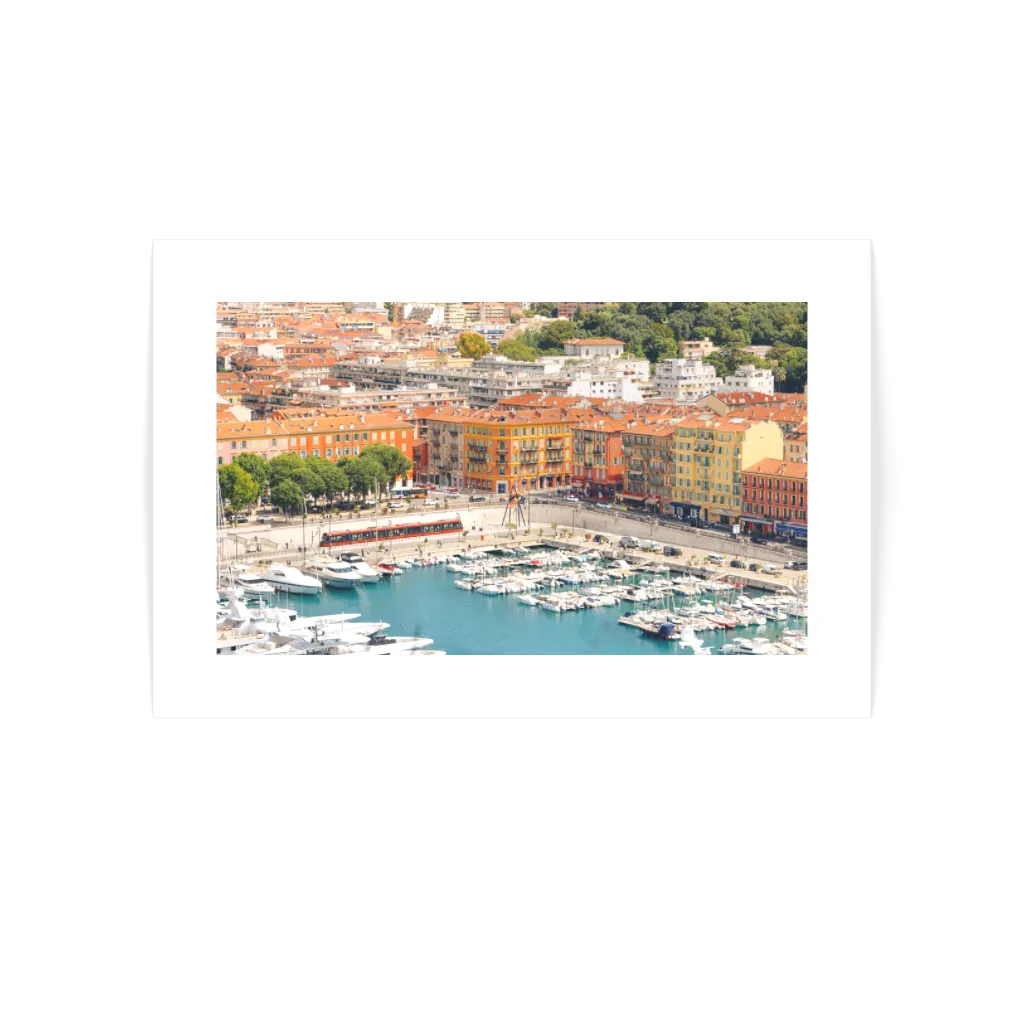 Bring the vibrant charm of Nice into your home with Port Lympia, a striking French Riviera Print capturing the city’s historic harbor. From this elevated perspective, the turquoise waters of the marina glisten against rows of sleek yachts, while the pastel and ochre façades of Old Town rise proudly in the background. The red rooftops and iconic tram line cutting through the scene add movement and color, reflecting the perfect blend of tradition and modernity that defines Nice.