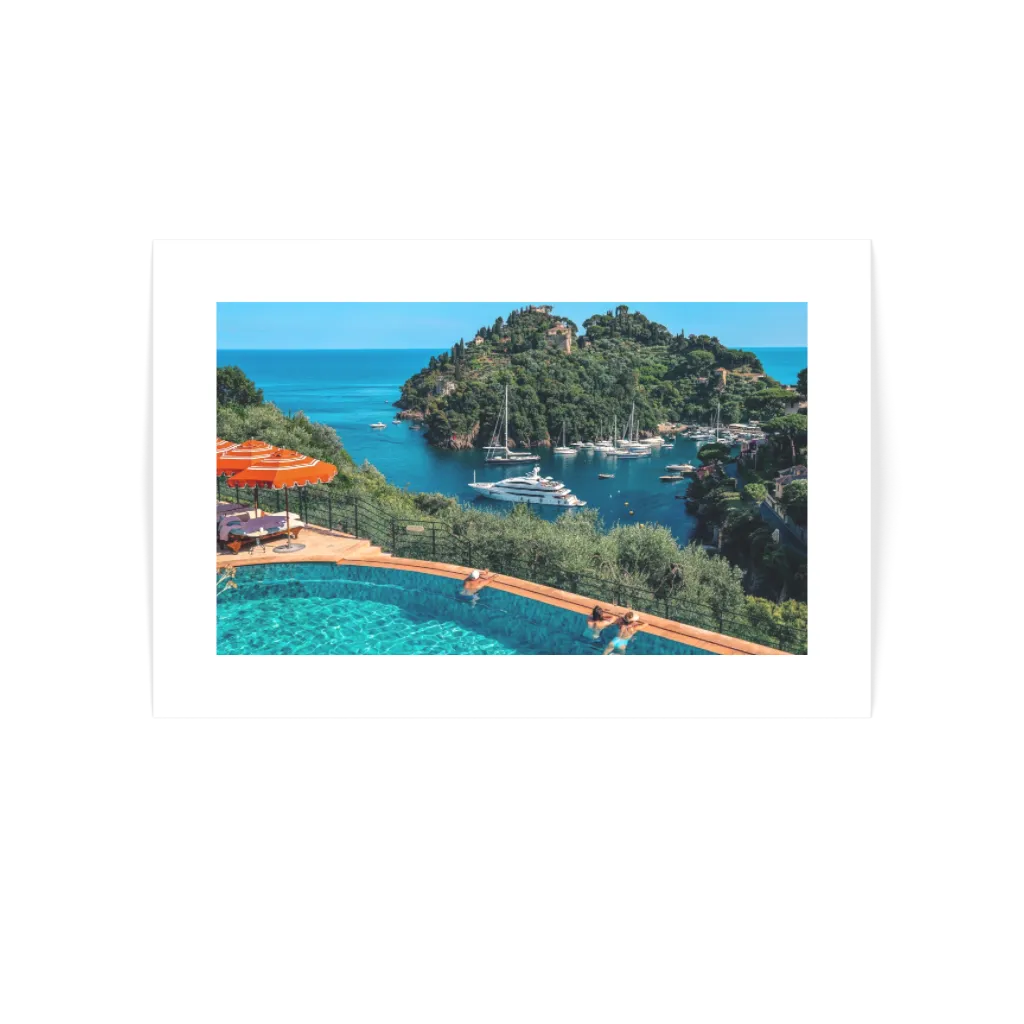 This photograph encapsulates the essence of Portofino’s allure: vibrant nature, sparkling waters, and a sense of tranquil sophistication. The inviting swimming pool in the foreground reflects the Mediterranean light, while the bay beyond paints a scene of serenity and luxury. With every detail — from the crisp lines of anchored superyachts to the lush greenery of the Ligurian coast — this artwork transports you directly to Italy’s most glamorous seaside retreat.
